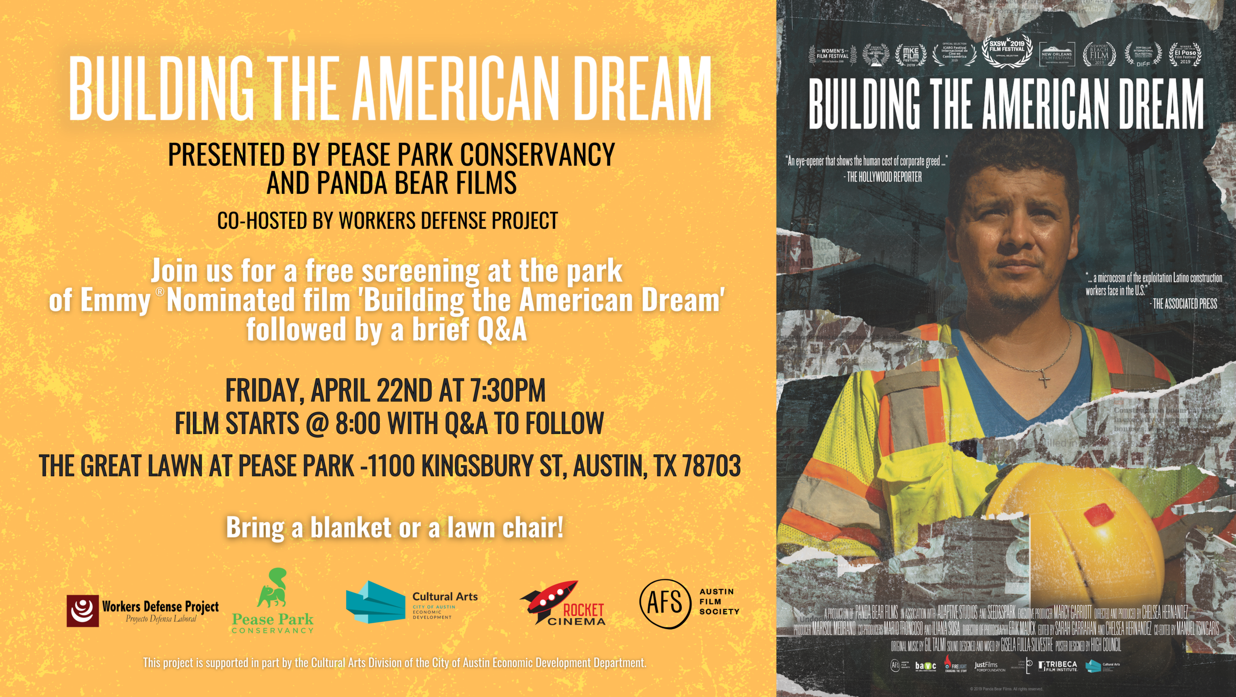 Join us on the great lawn for a screening of Building the American Dream. In Texas, construction workers face the deadliest conditions in the country. Building the American Dream follows three immigrant families who are rising up to seek justice and equality in an industry rife with exploitation.
