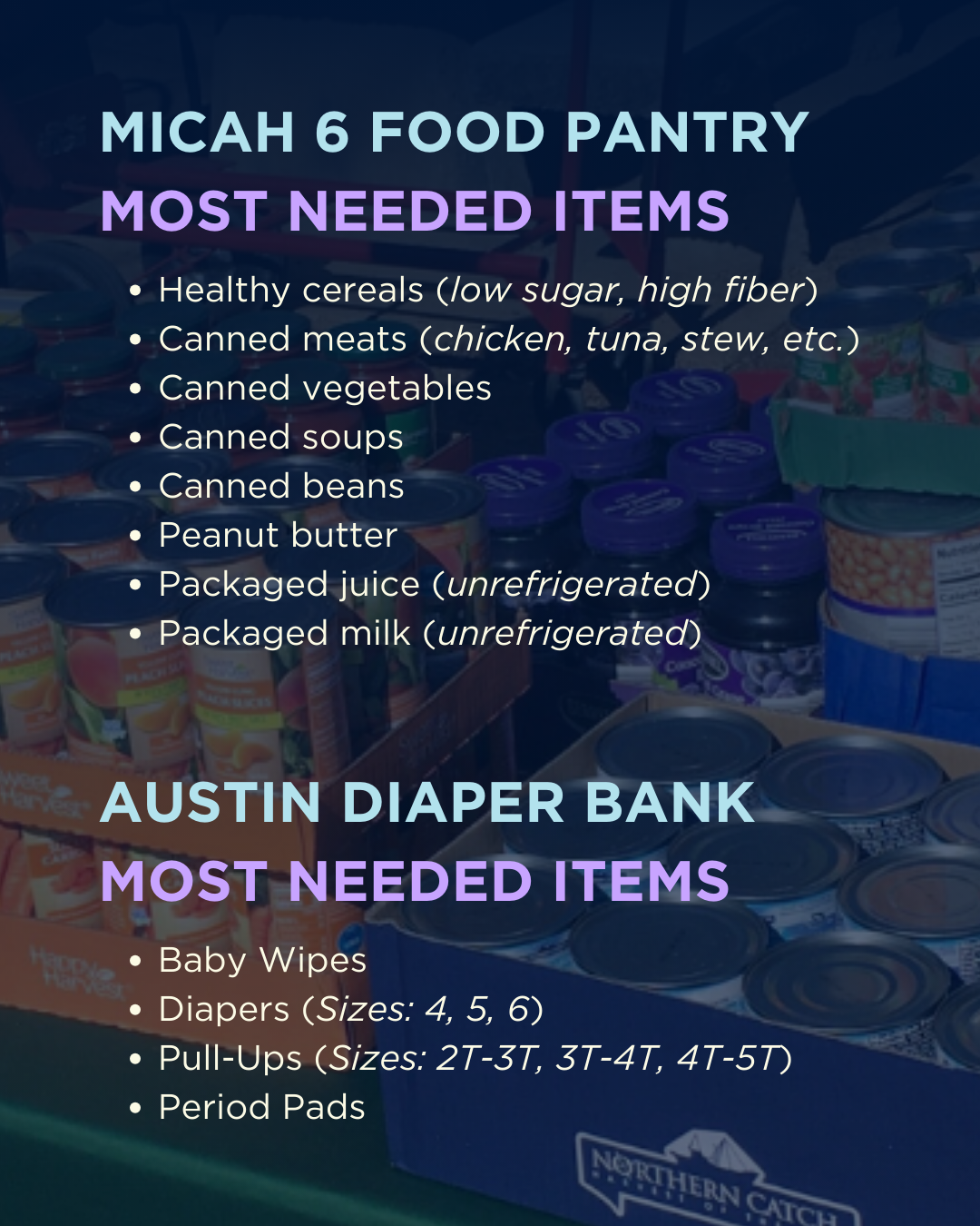 In honor of Martin Luther King Jr. Day, Pease Park Conservancy is hosting a donation drive for the Austin community! Stop by to drop off non-perishable food items as well as diapers and period products. Donations will be delivered to the Micah 6 food pantry and the Austin Diaper Bank.