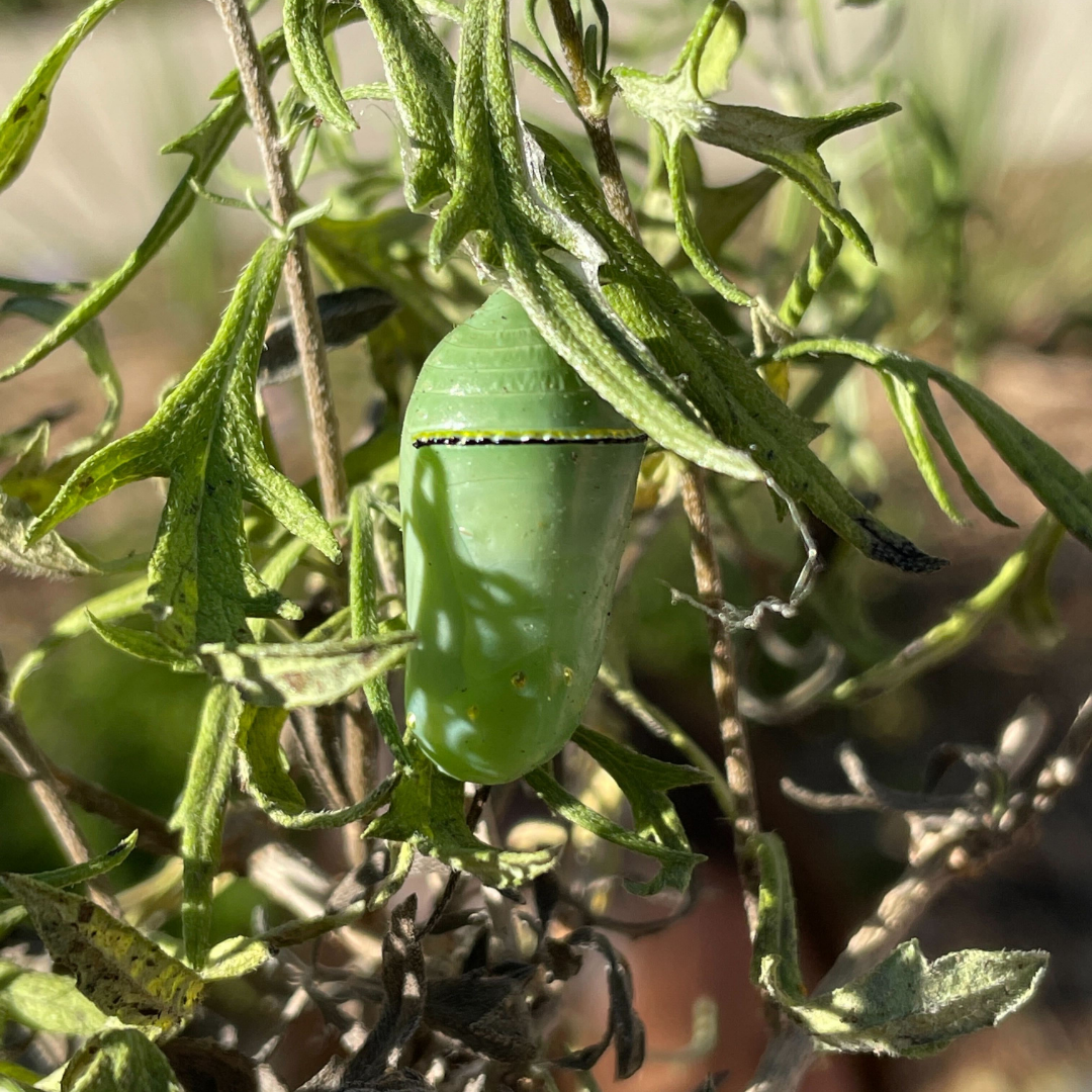 We currently have a monarch caterpillar feasting in Kingsbury Commons and our volunteer families recently found a chrysalis on one of our new plantings!